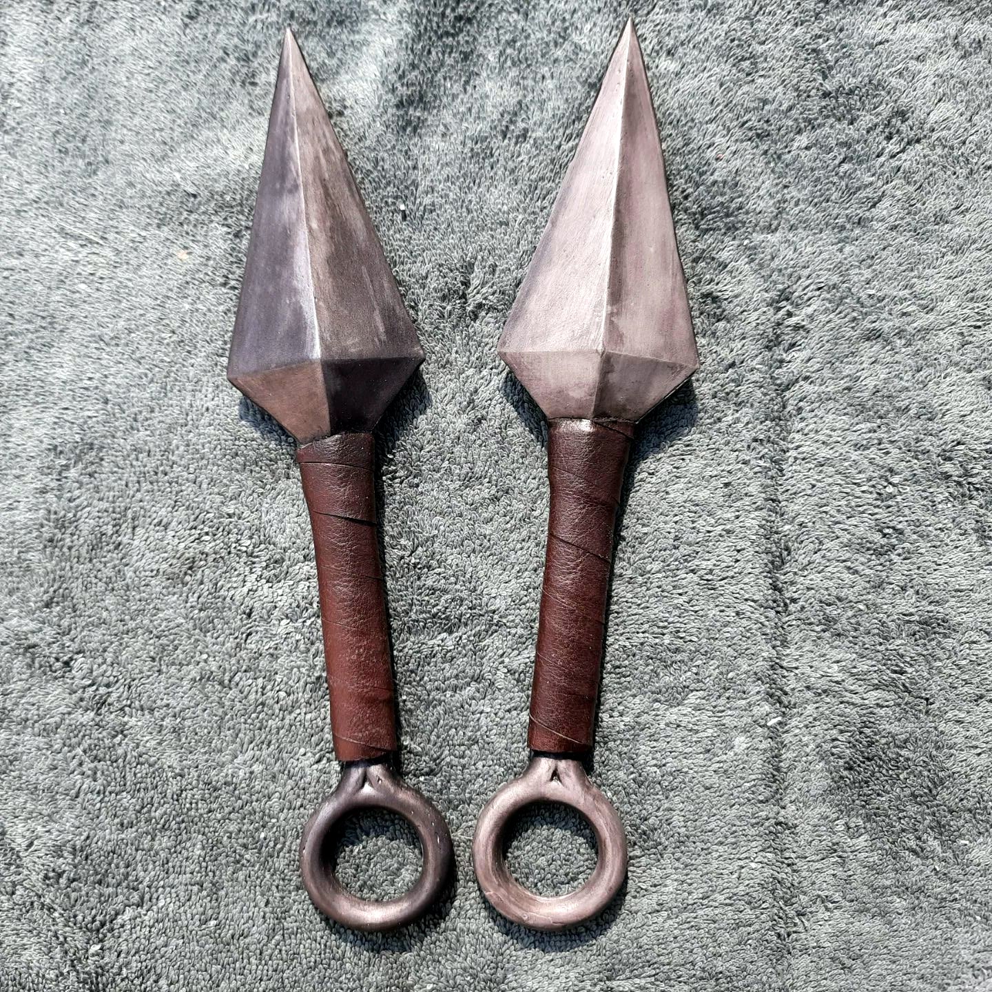 A pair of prop resin kunai, cold cast with aluminium for a polished metal sheen. Faux leather was used for the finishing wrap.