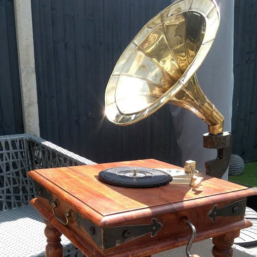 Functional and aesthetic, this gramophone was built from a wooden base and a brass horn. For function, a vinyl player was wired into a bluetooth speaker in the horn's base- offering audio from record, AUX, and Bluetooth. The hand crank was fitted to the volume controls.